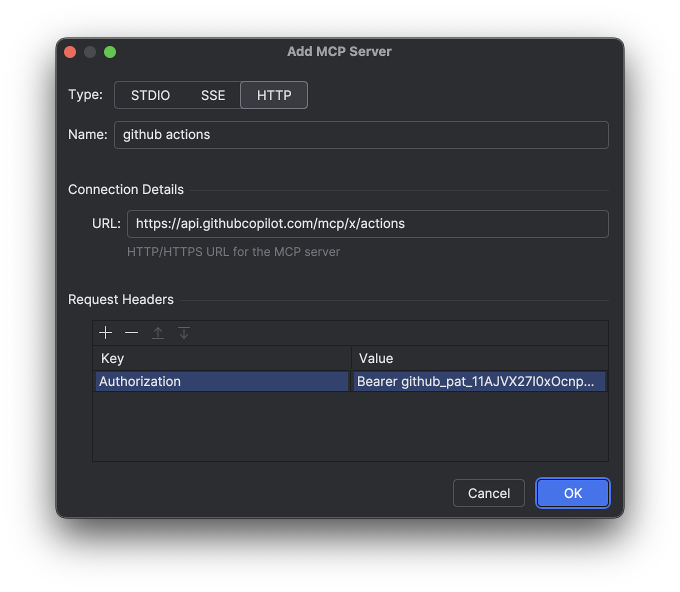 Для подключения через сетевой протокол введите URL желаемого MCP-сервера в соответствующее поле. Некоторые сервера для подключения требуют авторизоваться с помощью Bearer или иных способов. Для подключения, получите необходимый ключ и укажите его в секции "Request Headers"