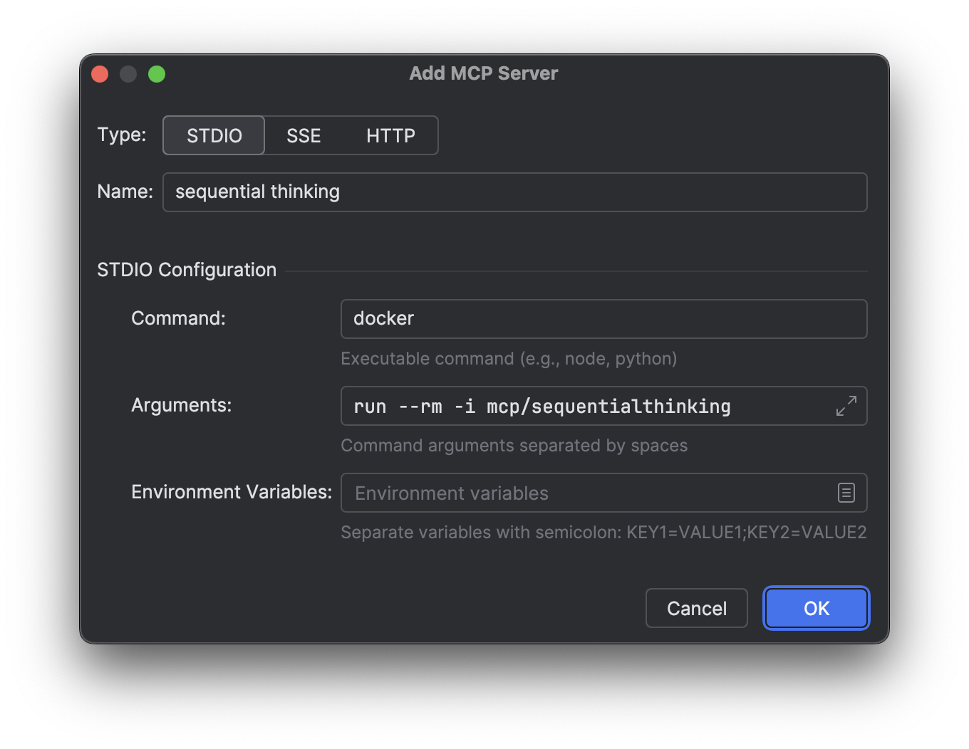 STDIO (Standart Input/Output) в основном используется для MCP-серверов, запущенных локально. Эта команда должна поднять MCP-сервер на вашей машине. Перед подключением убедитесь, что команда запуска успешно работает на вашей машине (например, docker-образ загружен и корректно стартует с нужными аргументами).